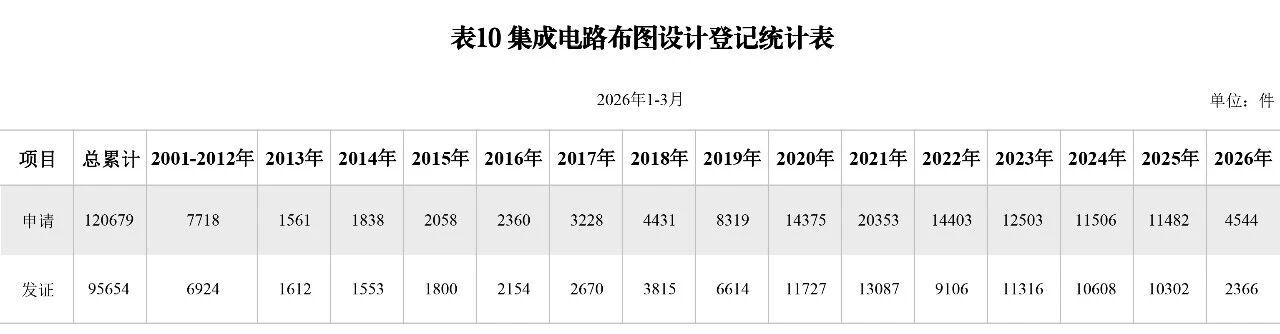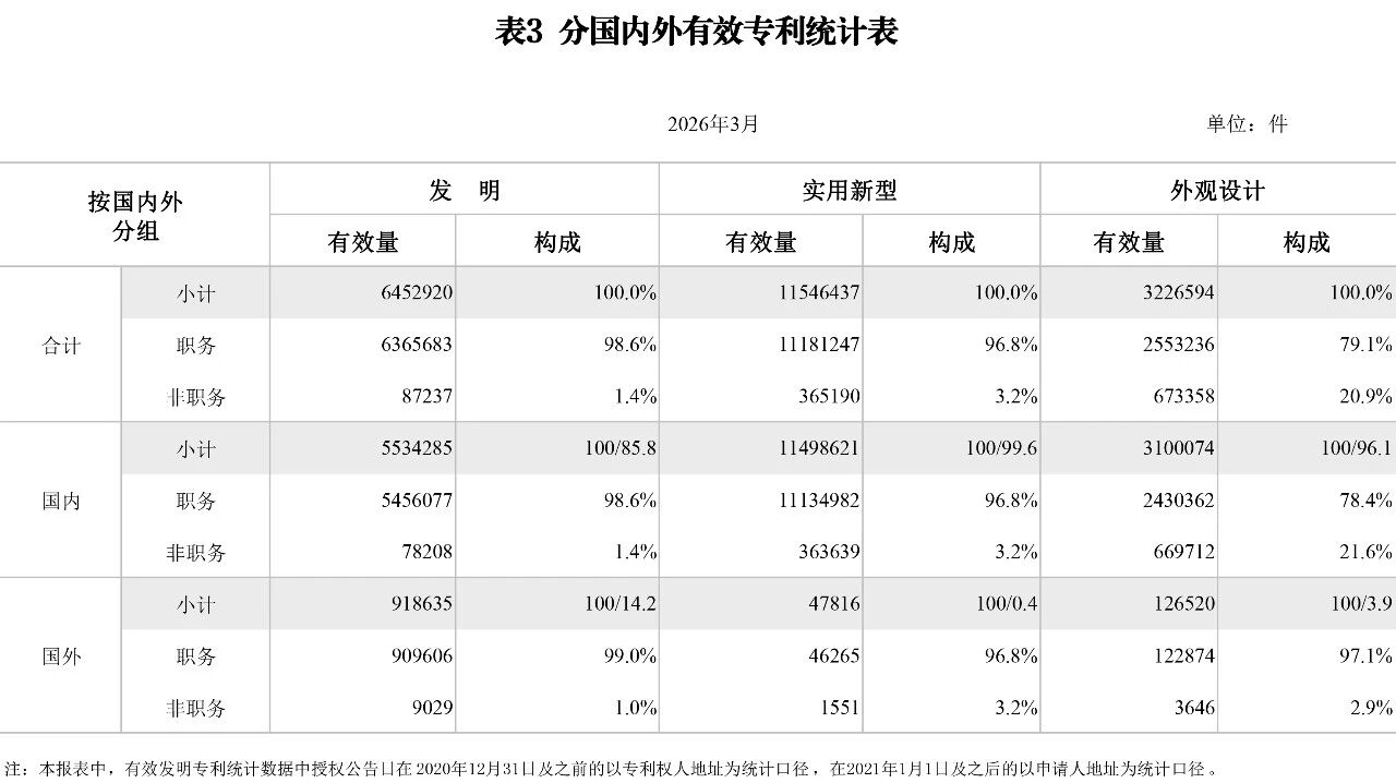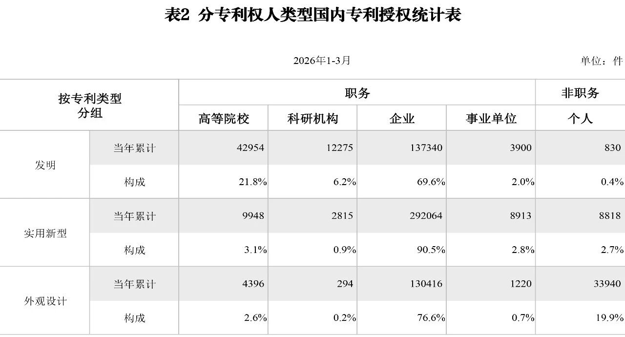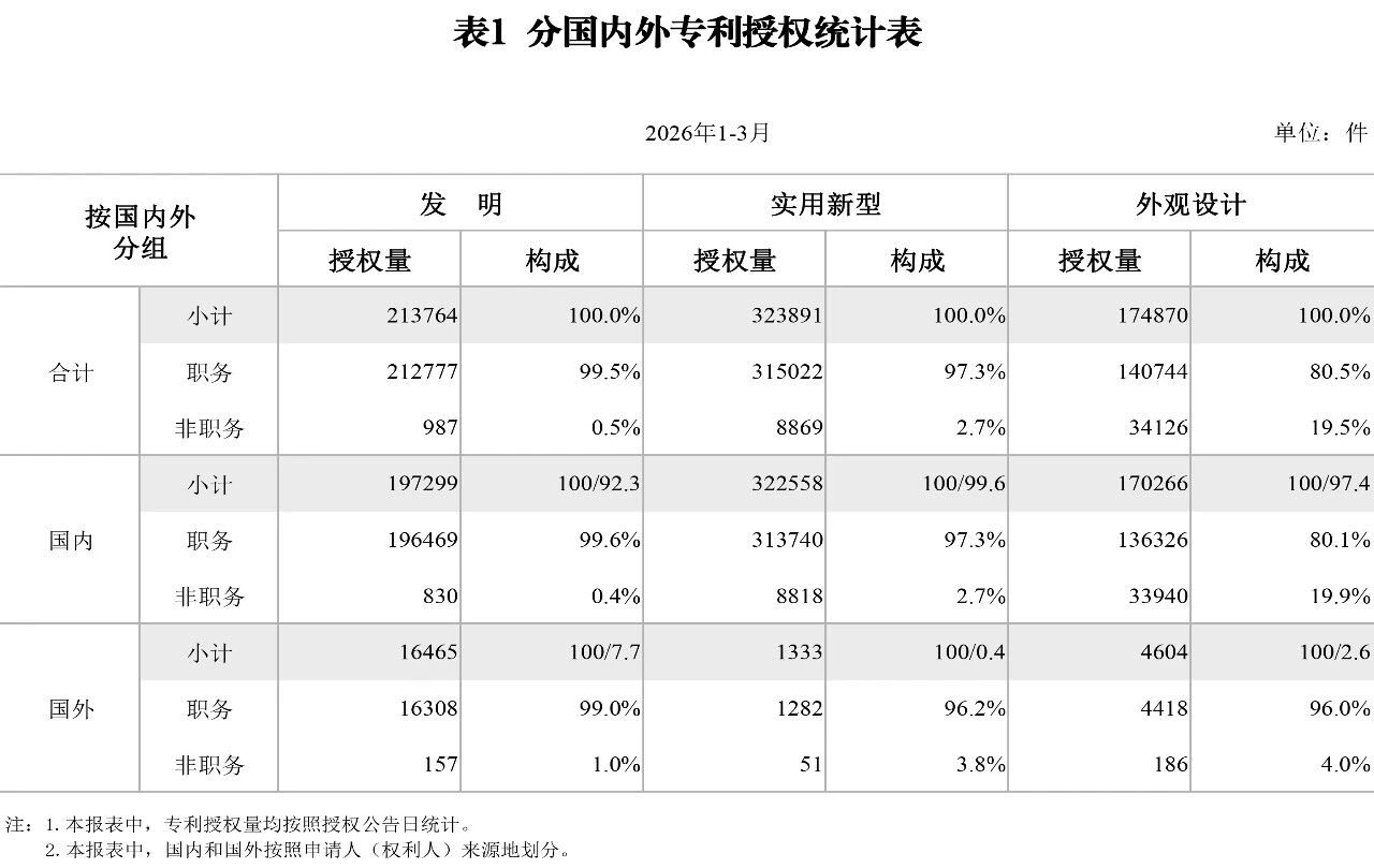 近日,国家知识产权局发布了2026年1-3月国家知识产权局审查注册登记统计月报。相较于2025年1-3月,2026年1-3月发明专利授权量同比增加7.41%,实用新型同比下降20.7%,外观设计增加8.58%。