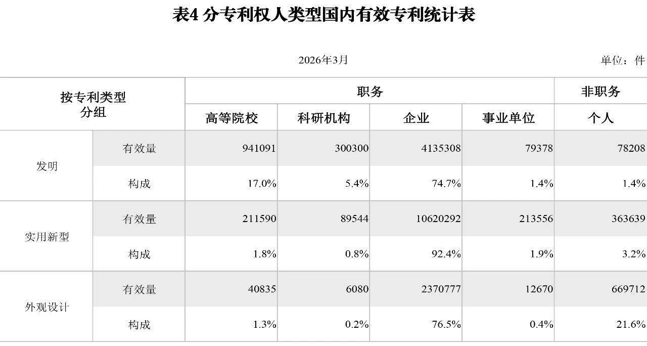 据此前国家知识产权局发布的数据显示:相较于2025年1月,2026年1月发明专利授权量同比增加3.35%,实用新型同比下降18.70%,外观设计增加9.31%。